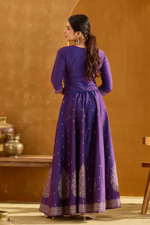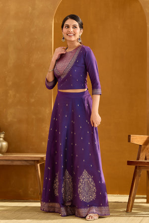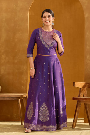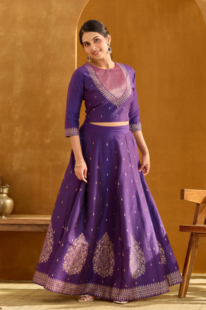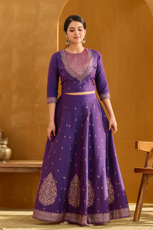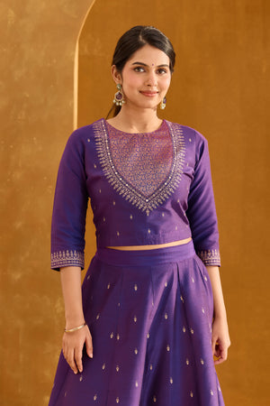 Grace your Diwali look with this purple skirt set in silky slub, featuring a brocade yoke with heavy threadwork, golden embroidered circular skirt, and comfy cotton lining.