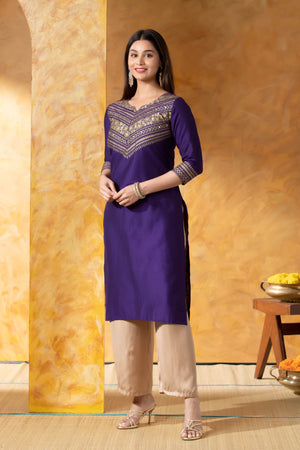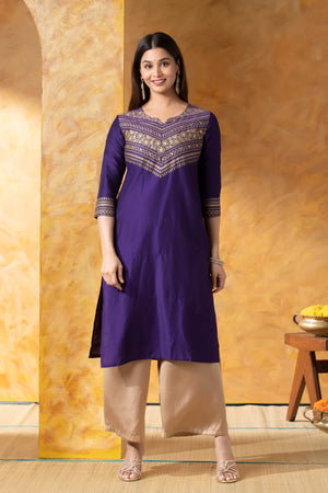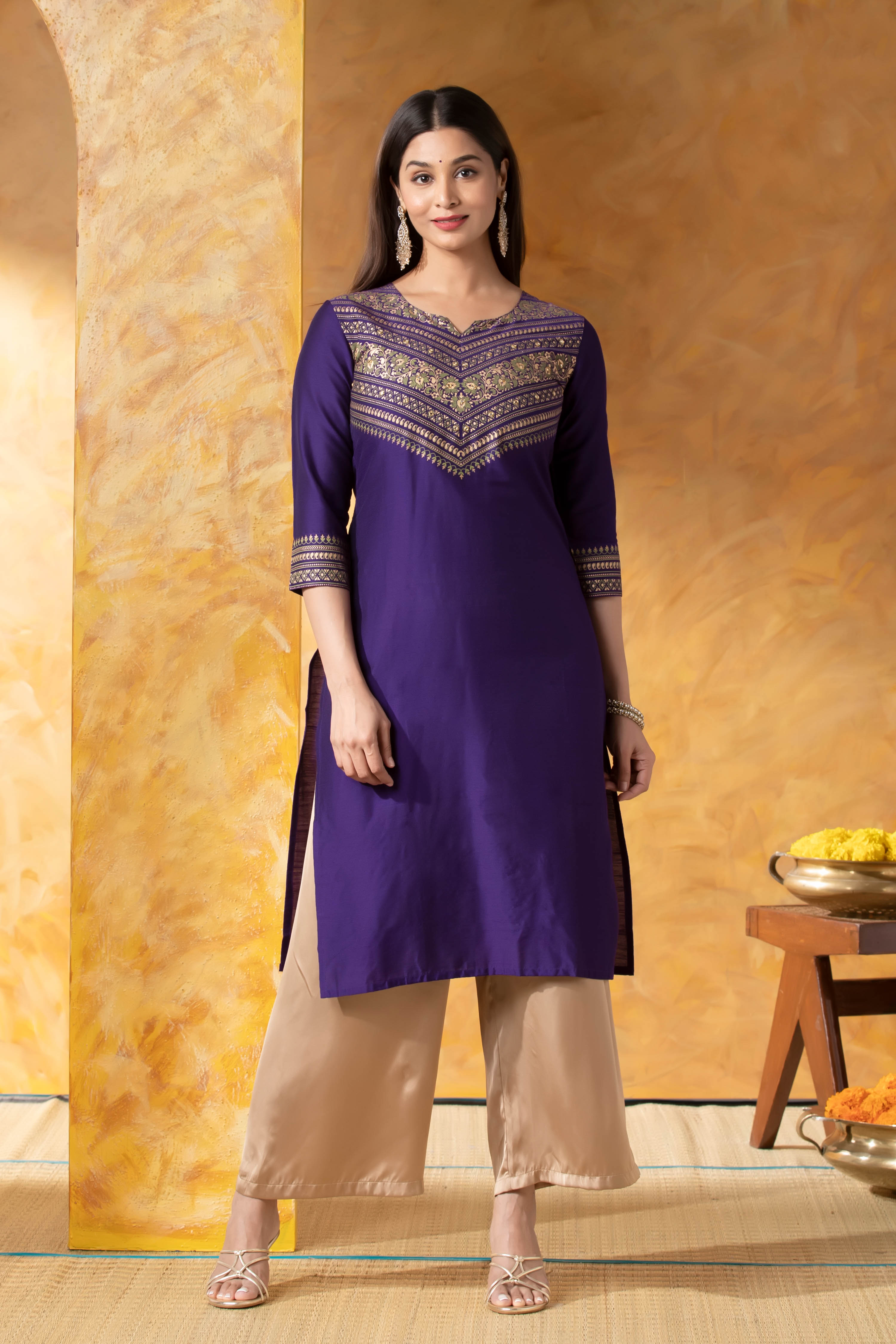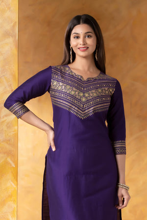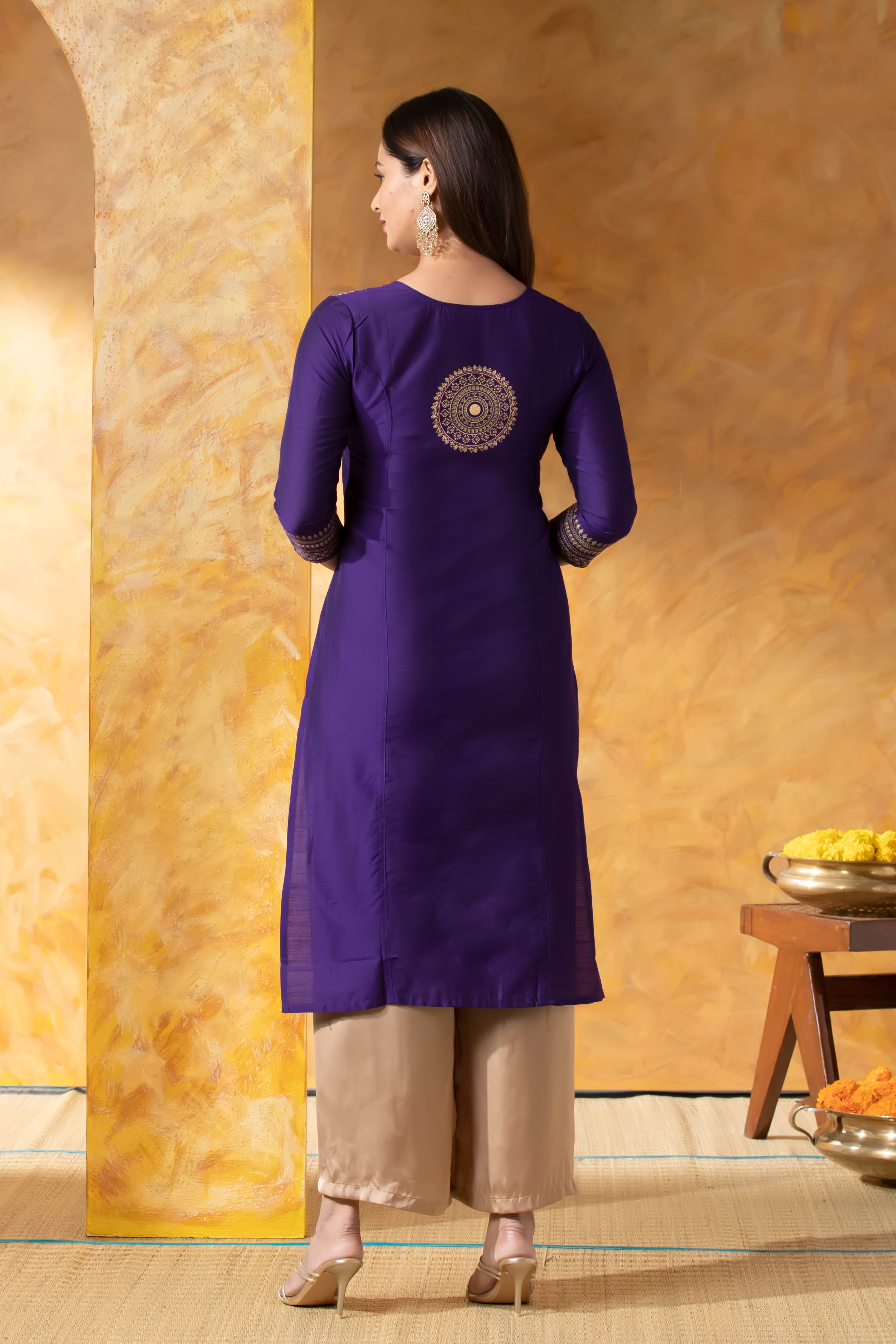 Purple Straight Kurta with Printed & Foil Mirror Work