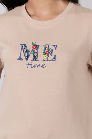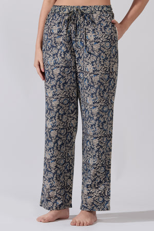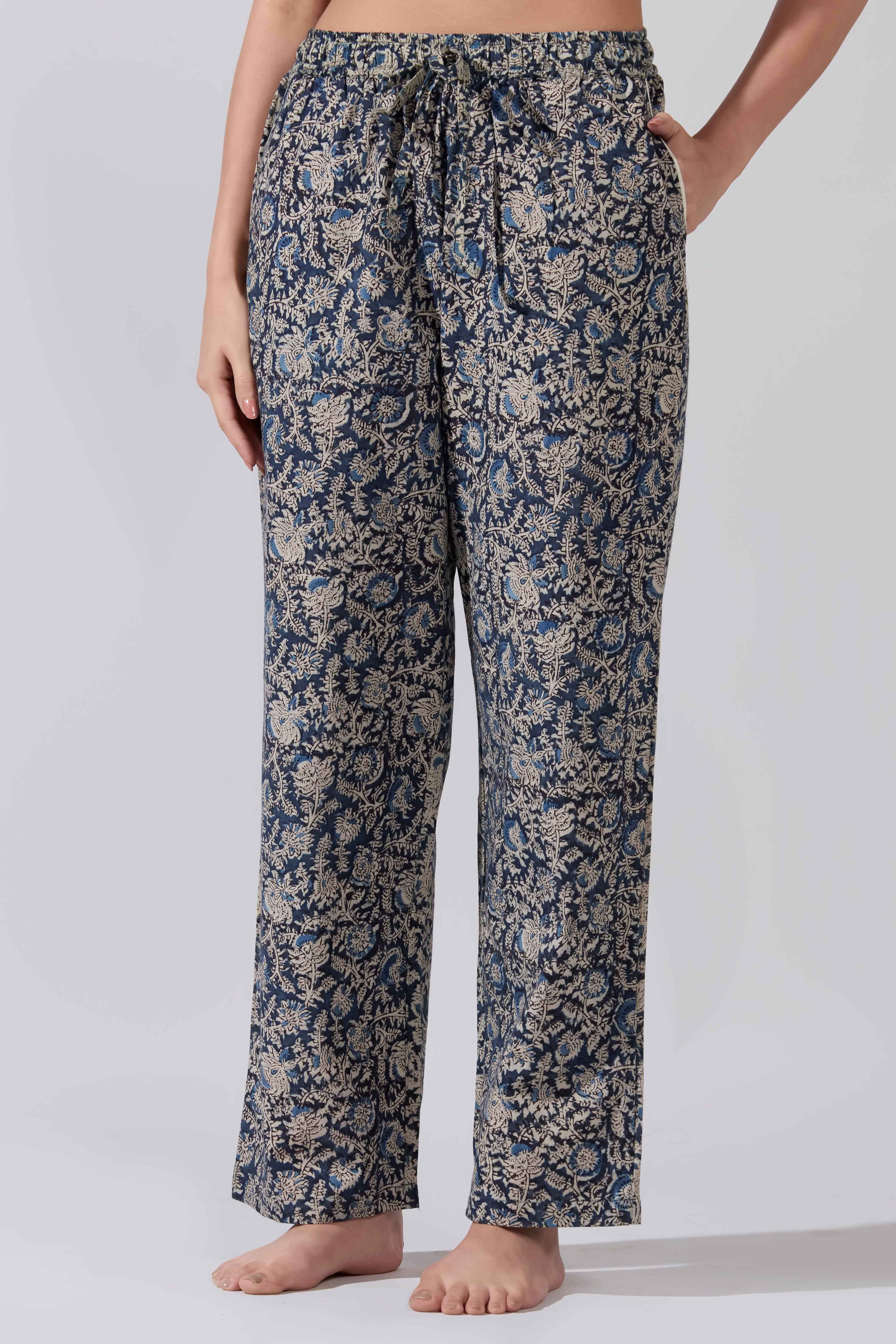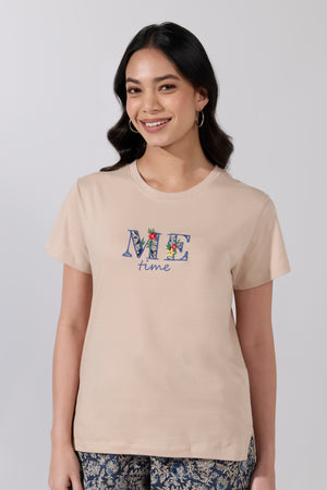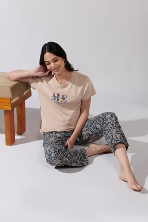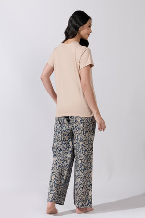 Beige & Blue Kalamkari Cotton Pyjama Set with Me-Time Printed T-Shirt