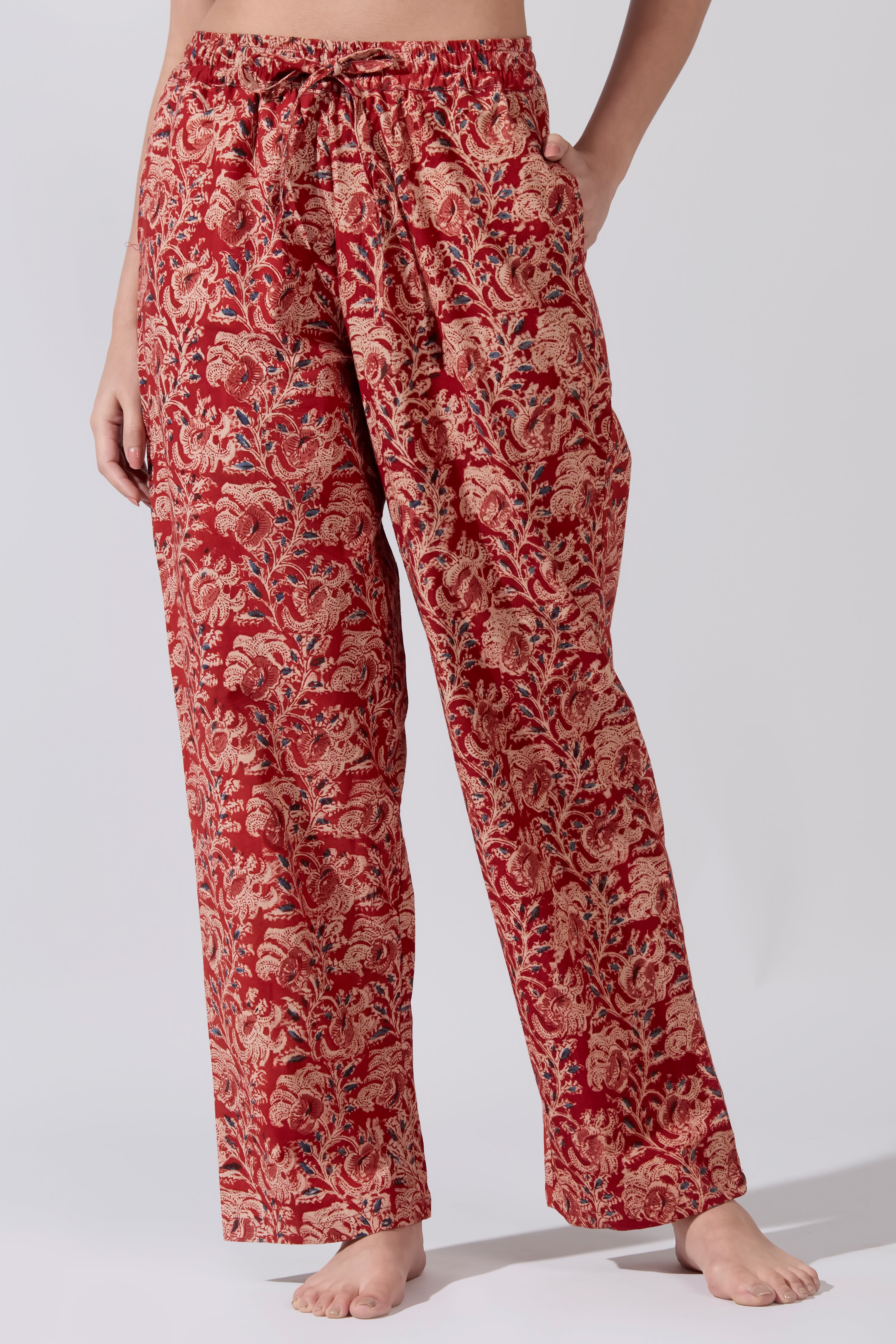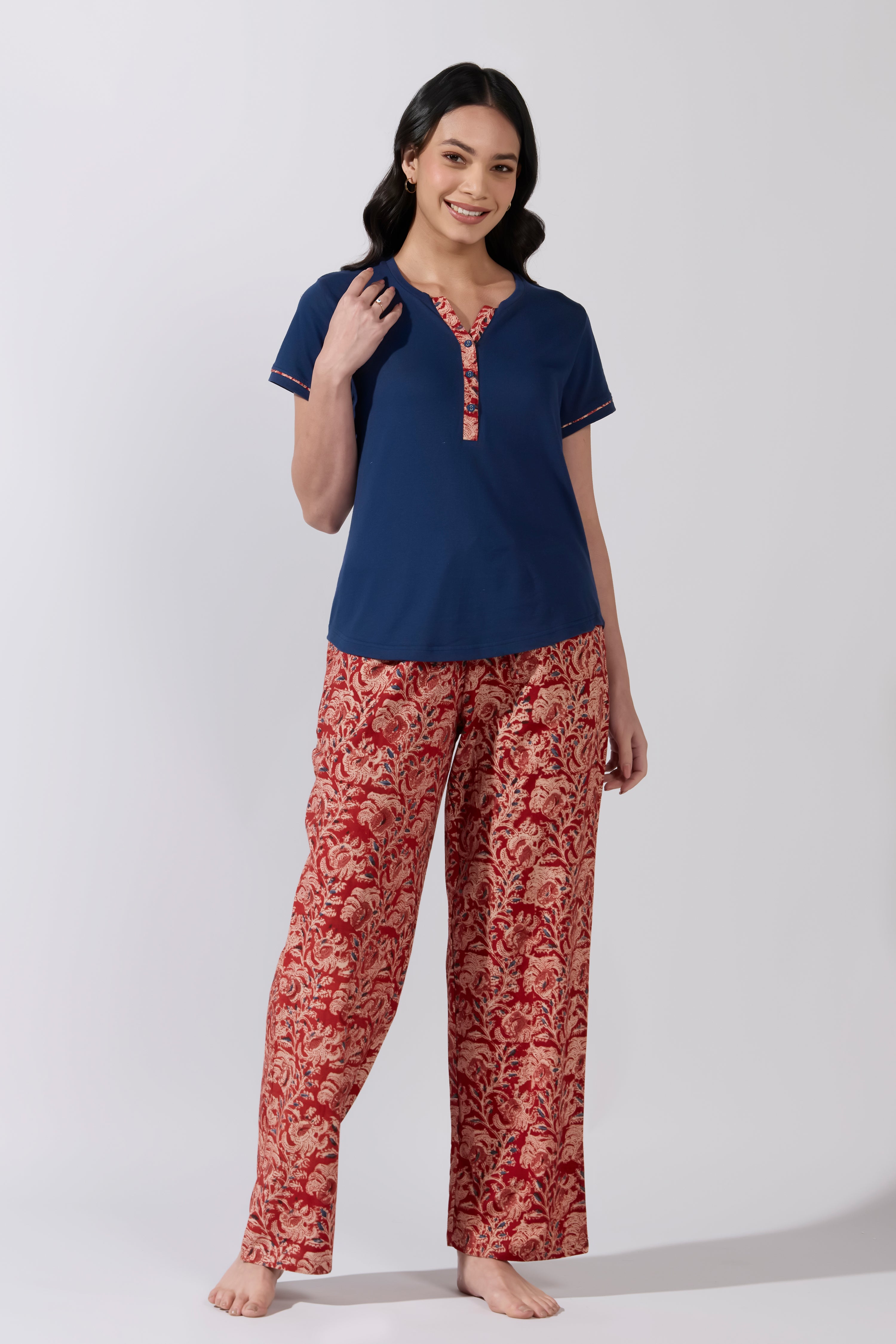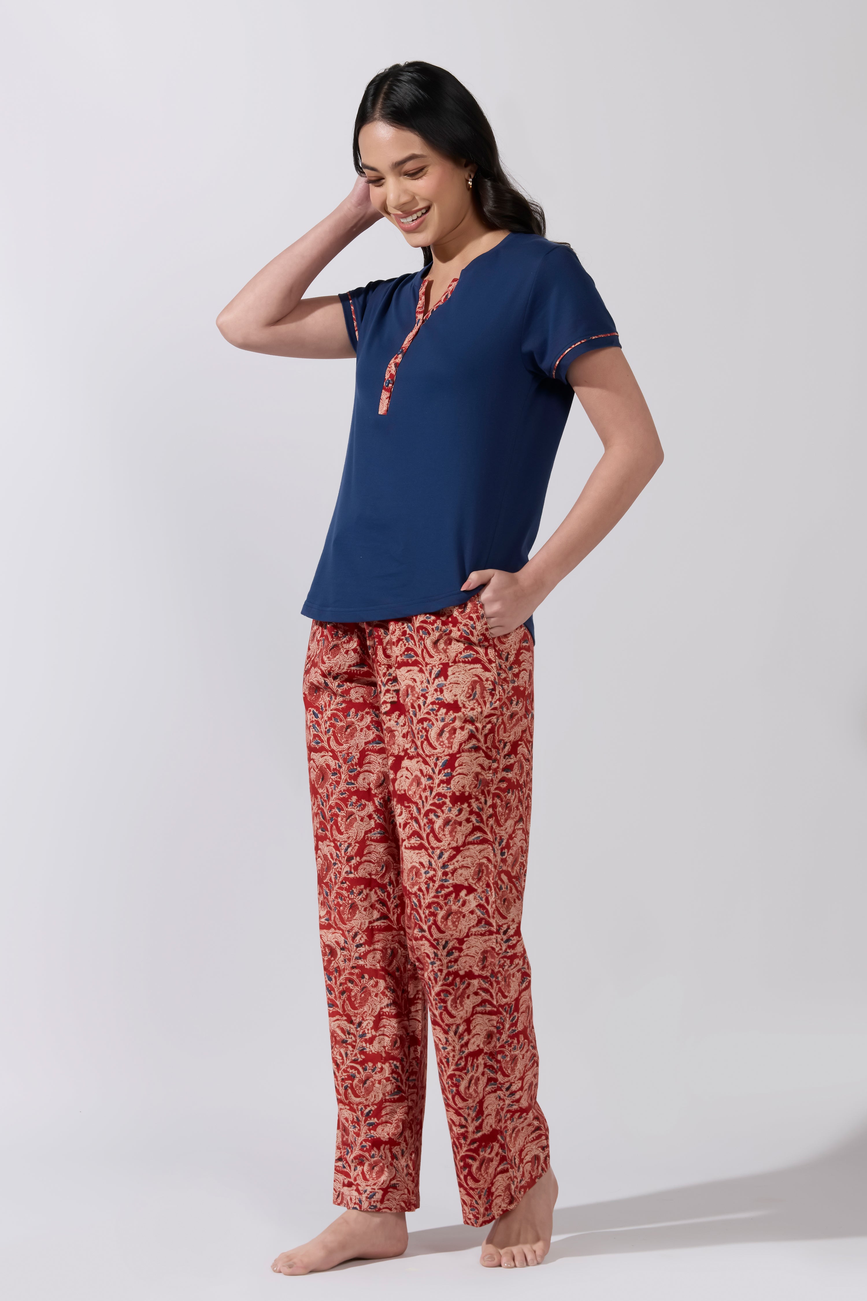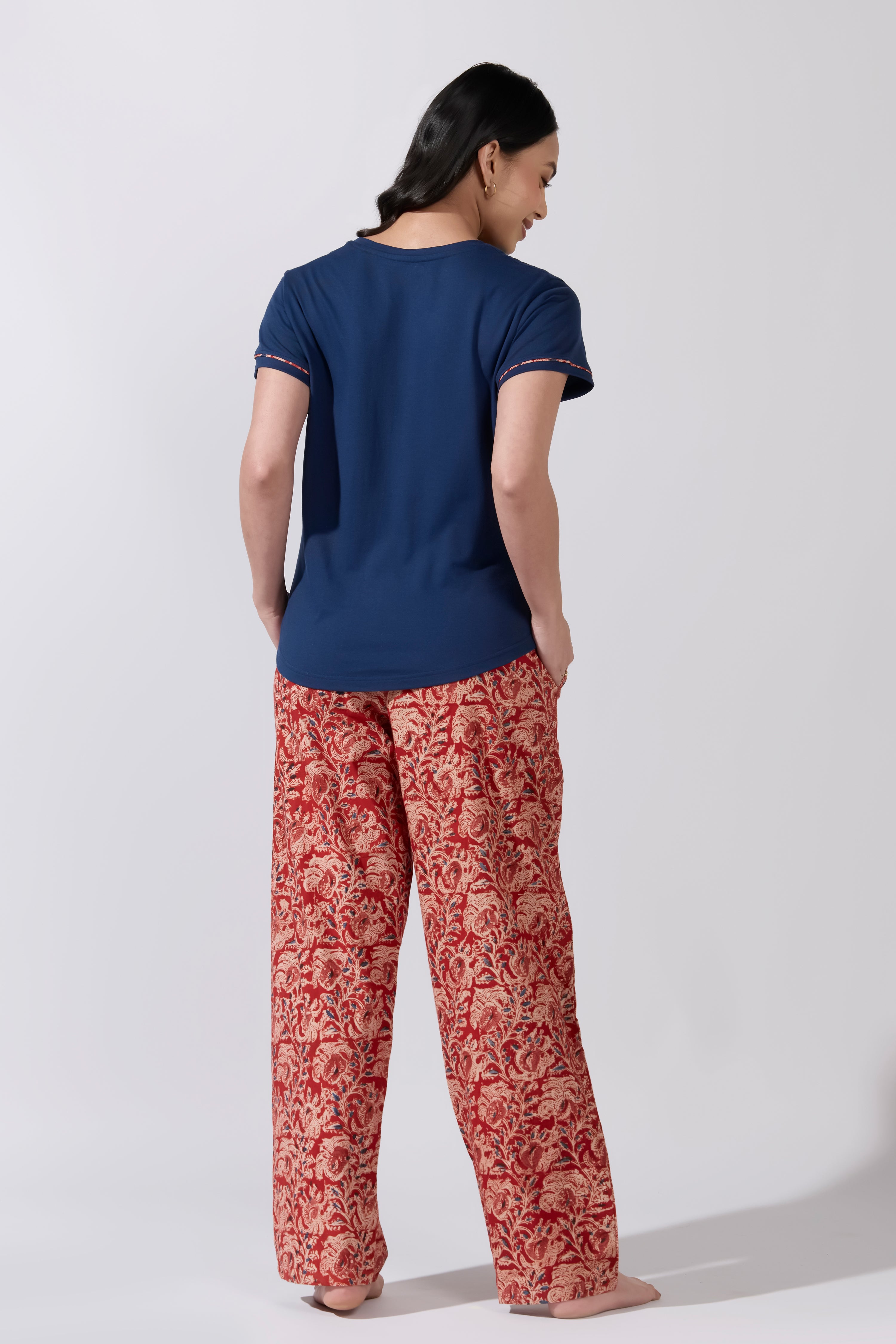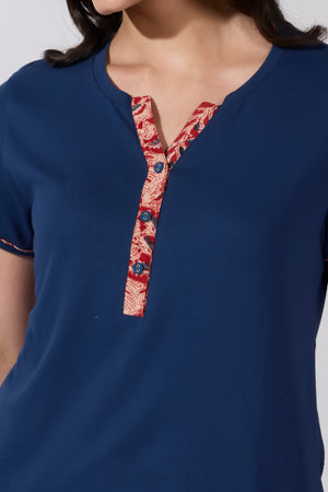 Kalamkari Printed Cotton Pyjama Set with Navy Solid T- Shirt