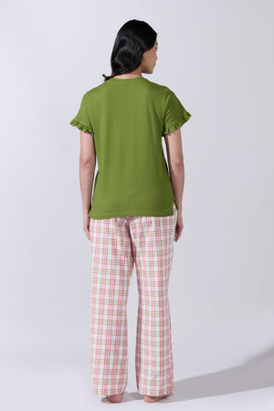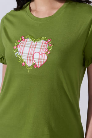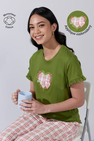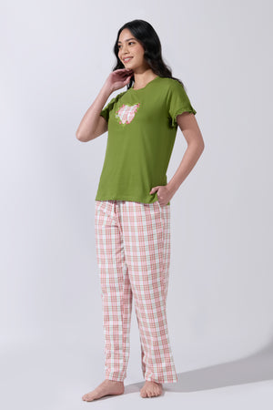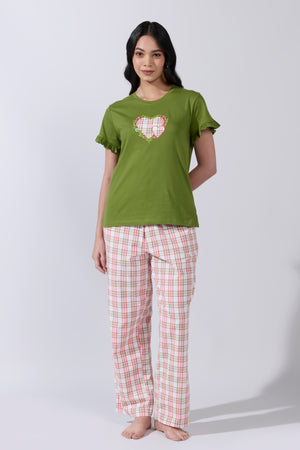 Heart Applique Embroidered Pyjama Set with Checkered Cotton Pant