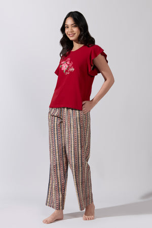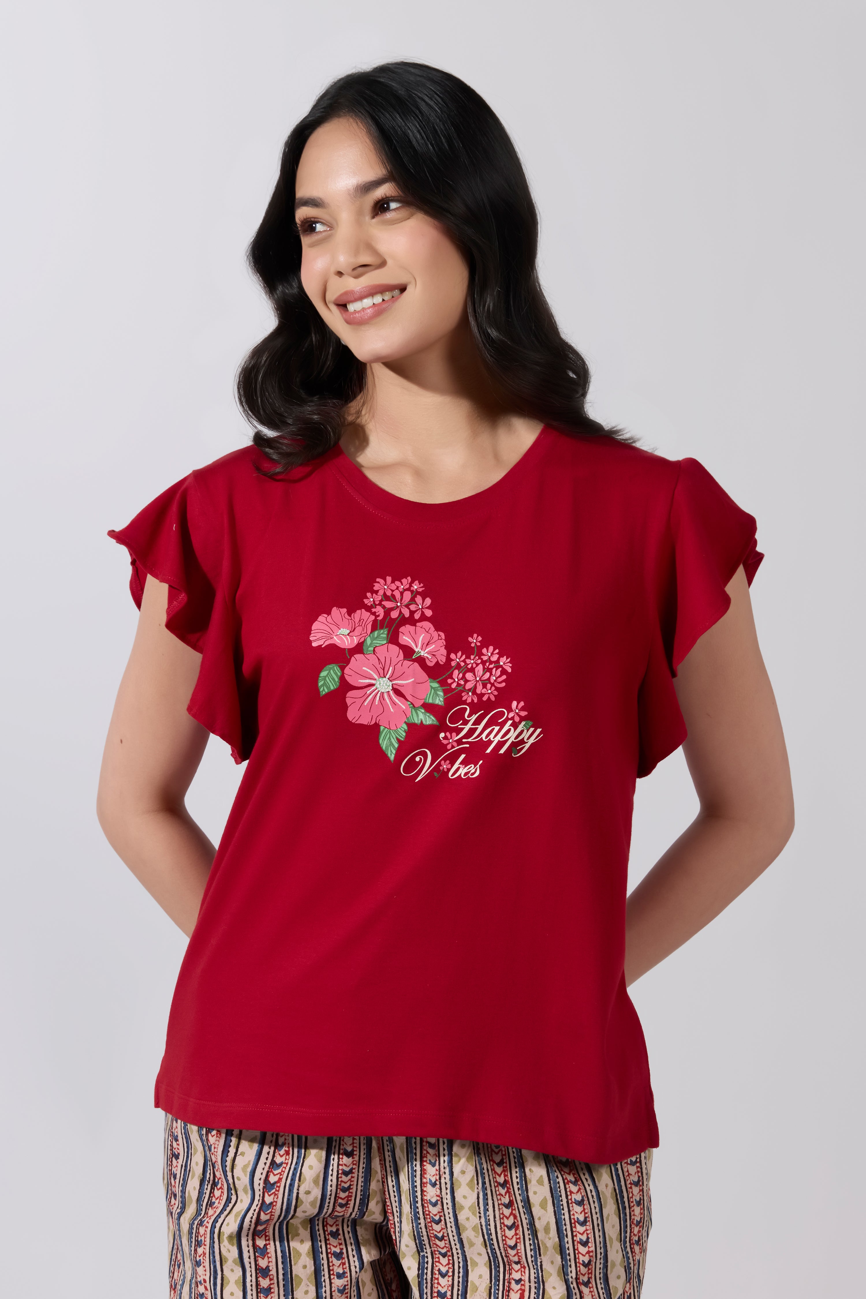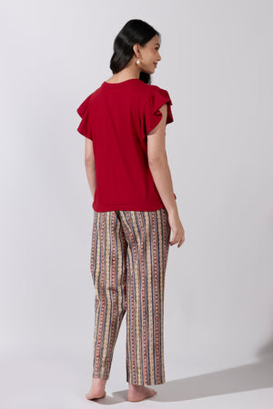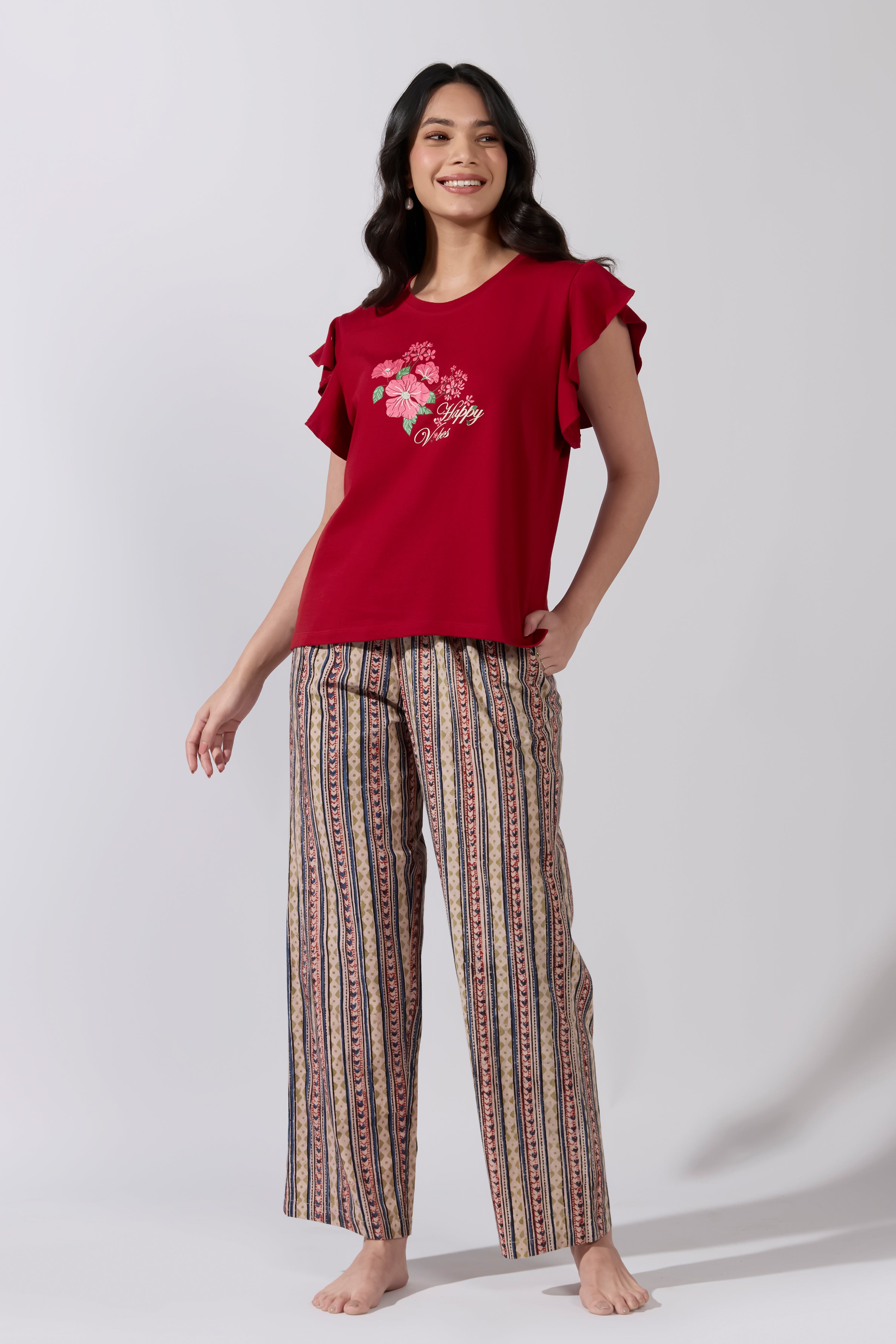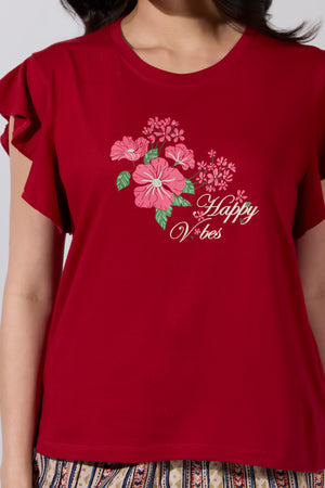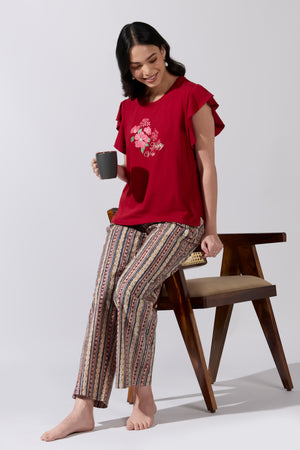 Happy Vibes Printed Red T-Shirt with Kalamkari Printed Pyjama Set