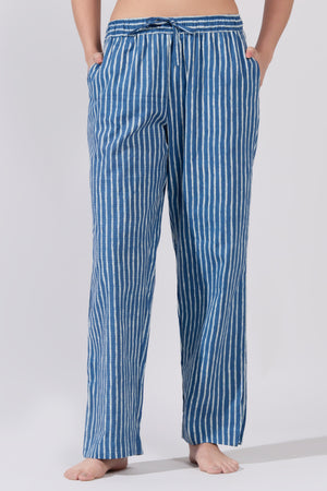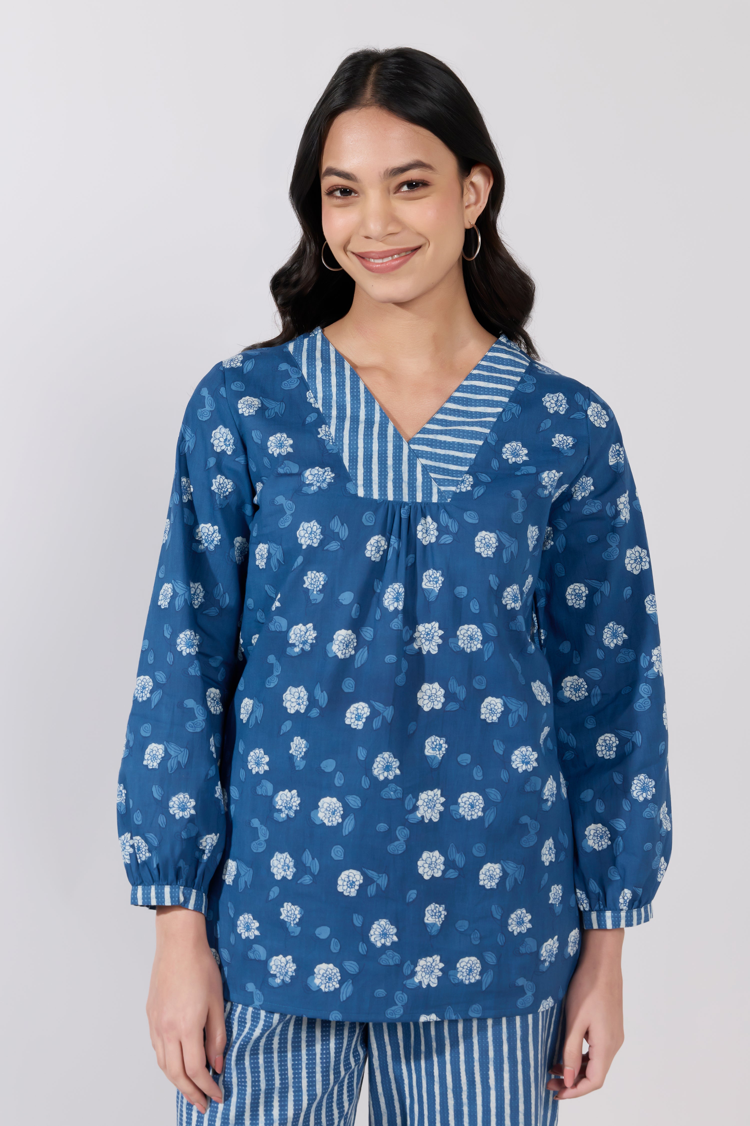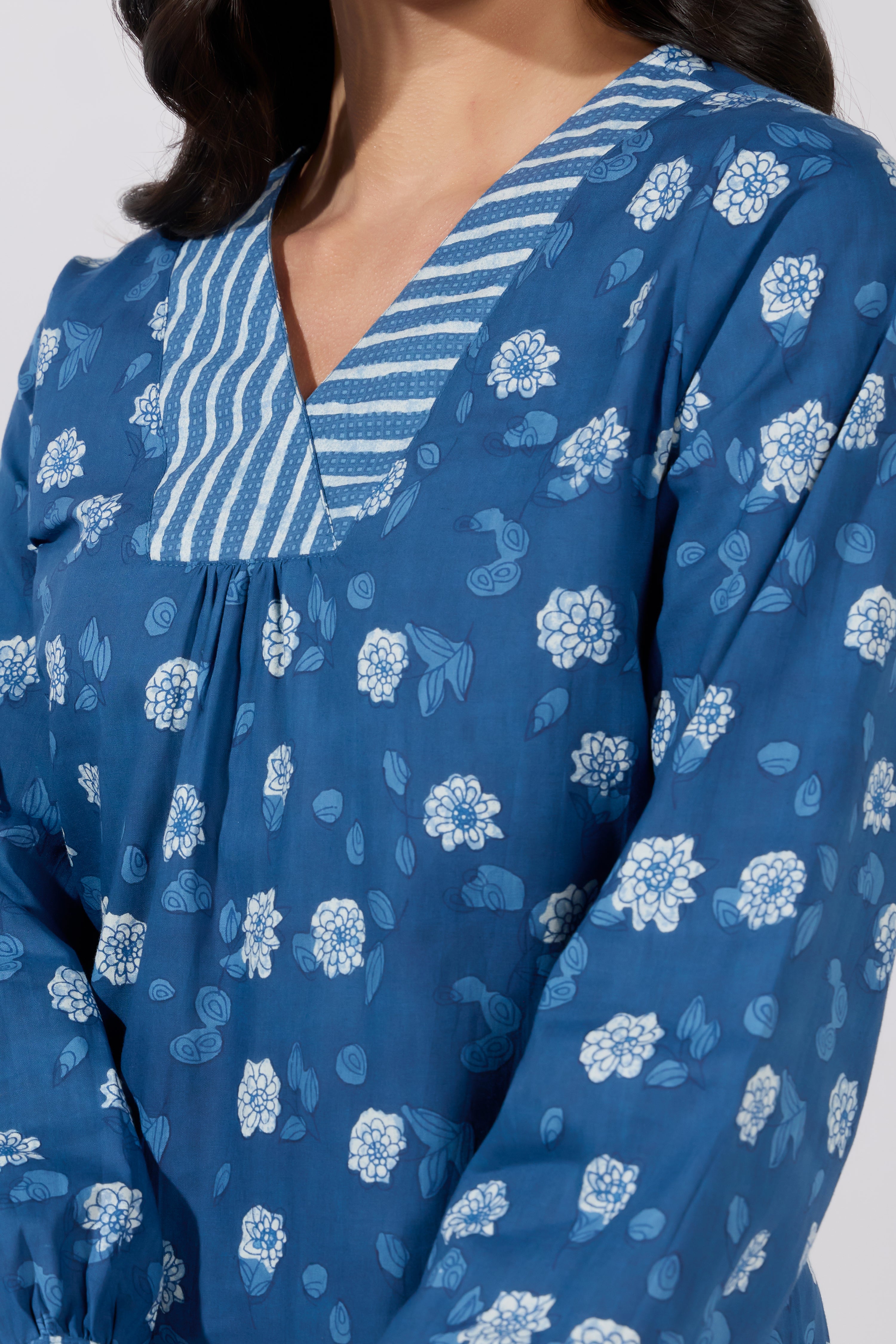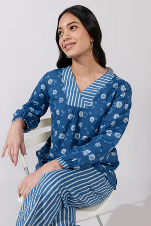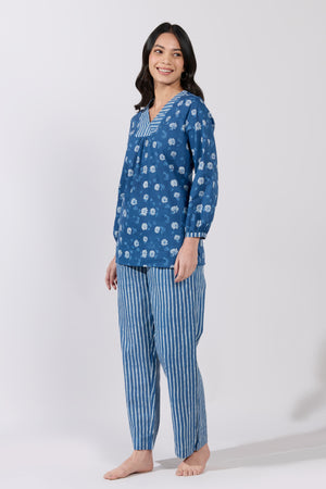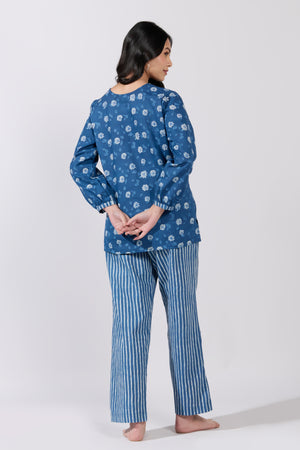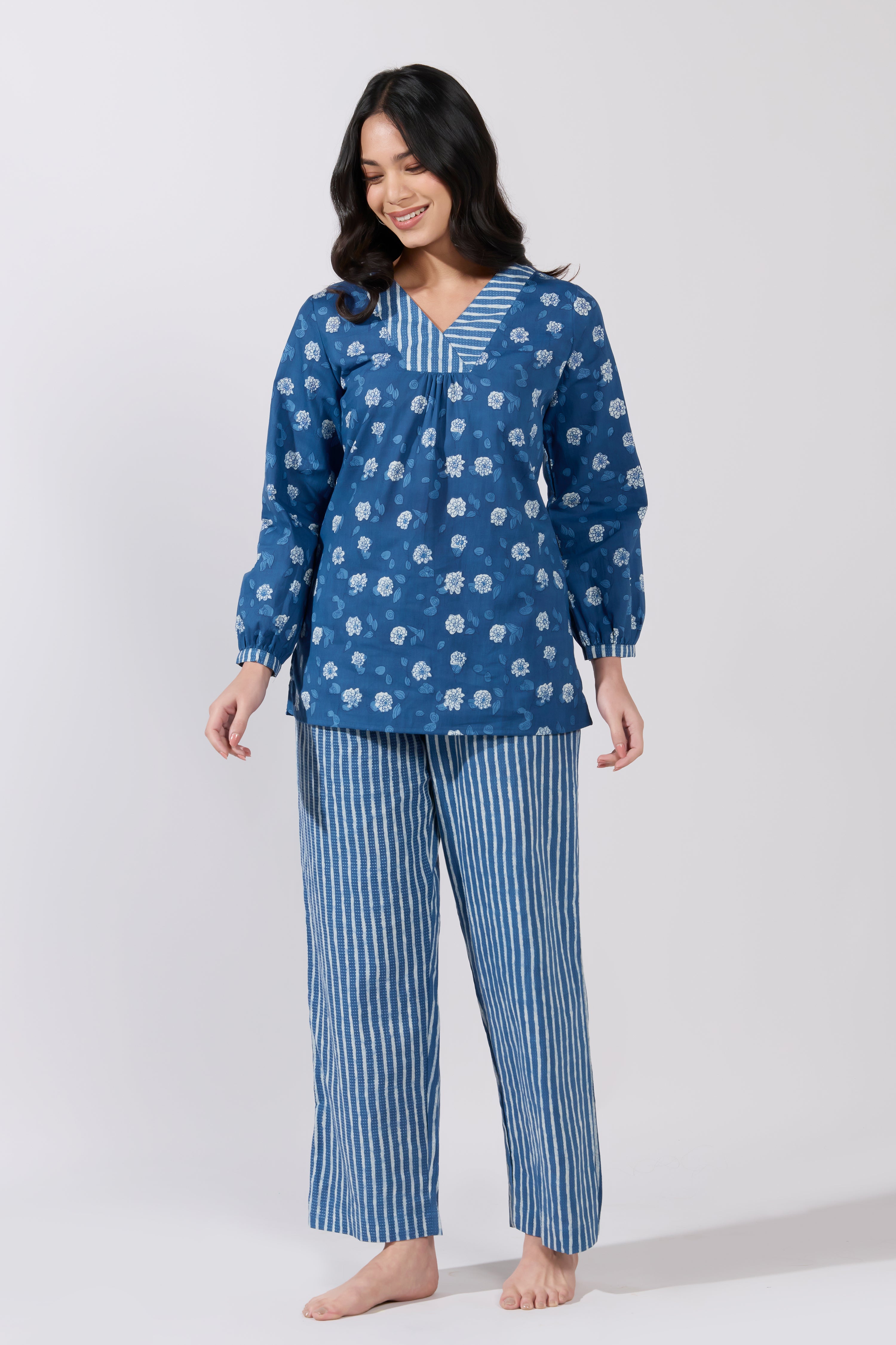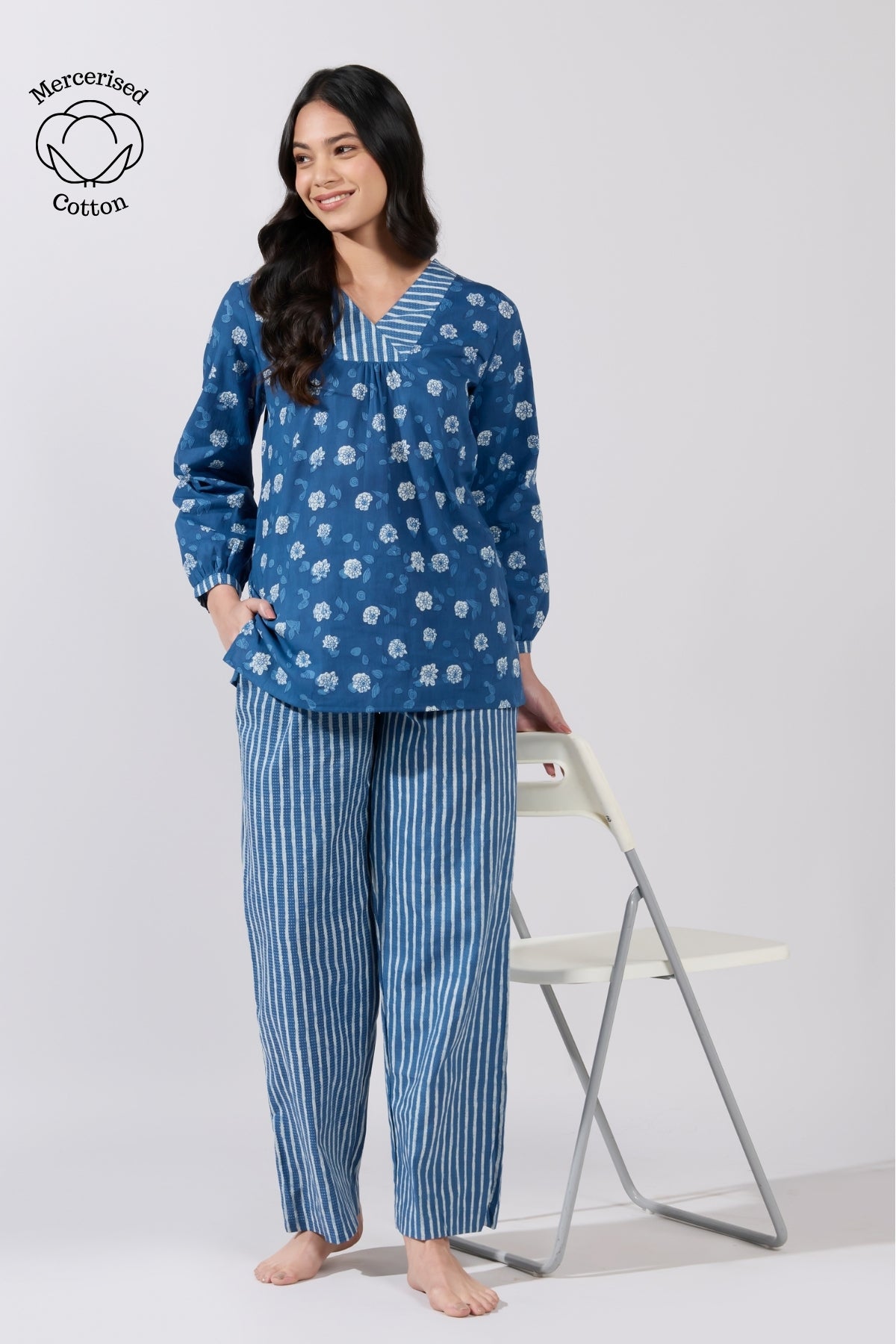 Indigo Floral Printed & Striped Blue Cotton Pyjama Set
