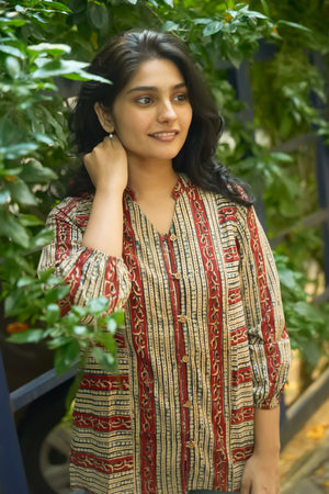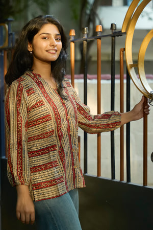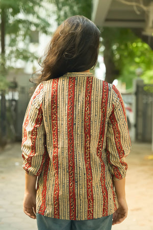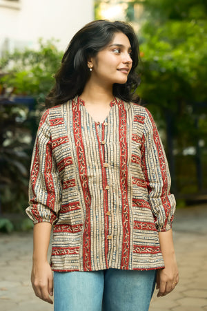 Stylish red & beige cotton tunic with mandarin collar, full sleeves & front buttons. Perfect for casual or office wear, blending comfort with Indian-inspired elegance.