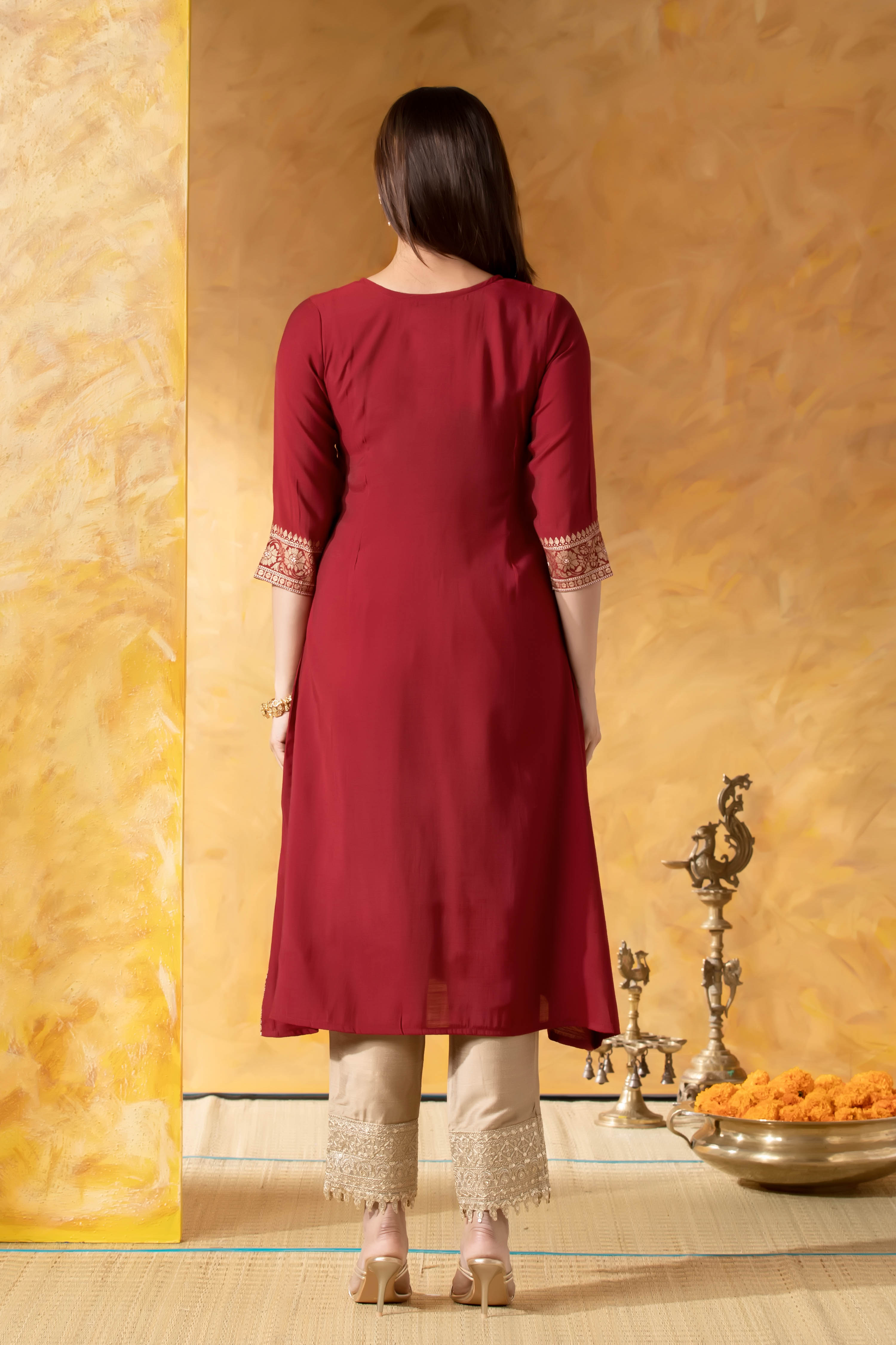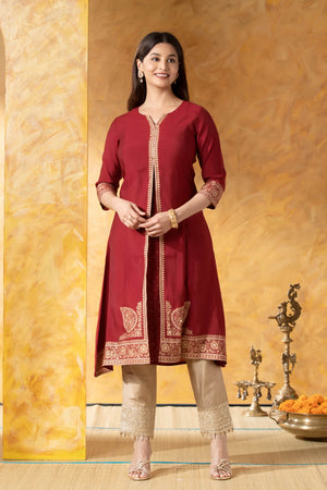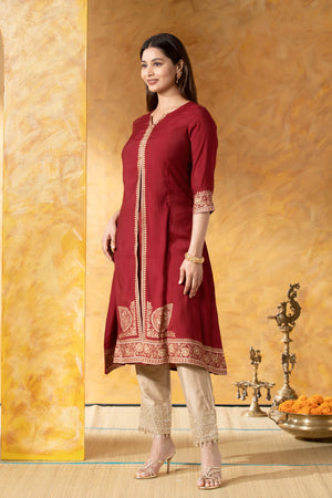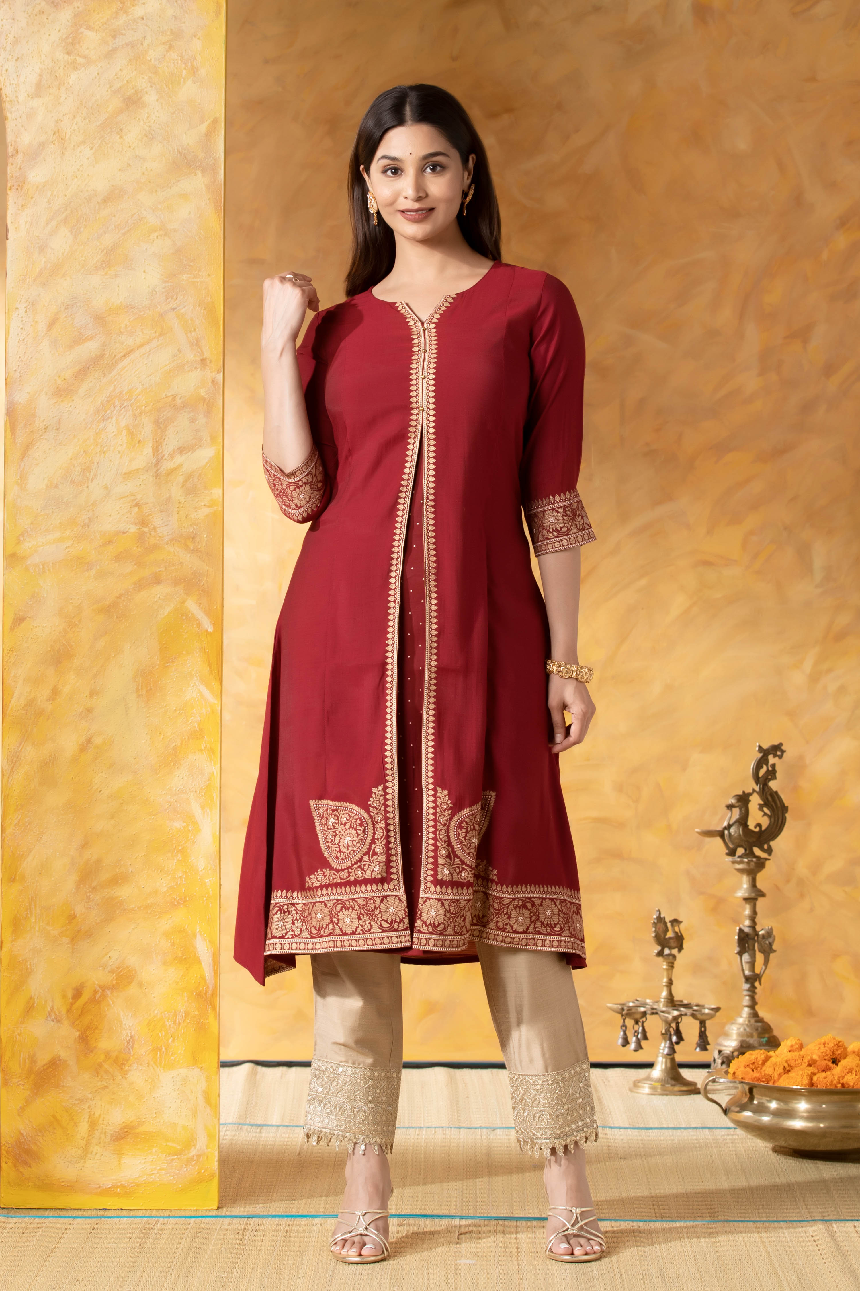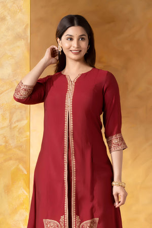 Elevate your festive style with this Red A-line kurta featuring a front slit, round V-neck, and elegant brocade work. Crafted in makati fabric, this outfit is perfect for Diwali celebrations and traditional occasions.