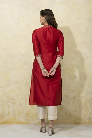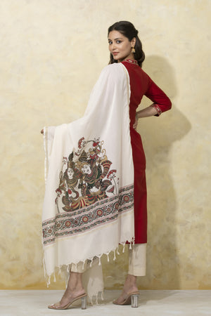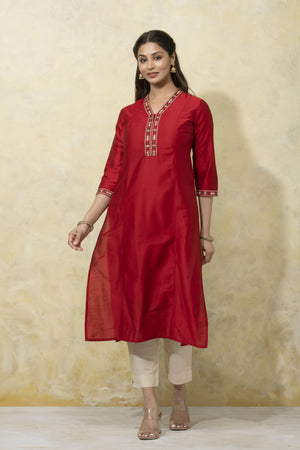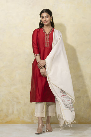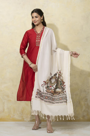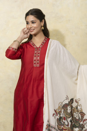Celebrate tradition in this elegant red and off-white kurta set from the Vishu Collection, featuring an art silk straight-line kurta with intricate embroidery, paired with off-white art silk bottoms. The highlight is the beautifully mural-printed placement dupatta in cotton, making it a timeless choice for festive occasions.