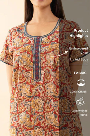 Kalamkari Printed & Embroidered Nighty - Red