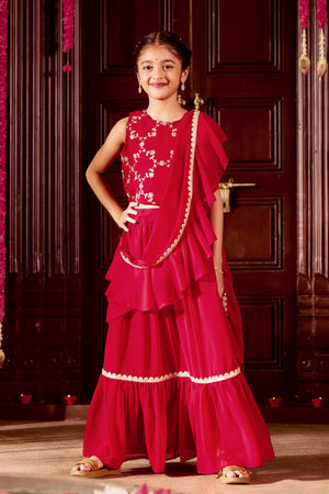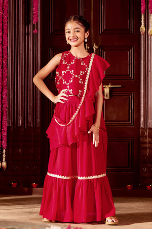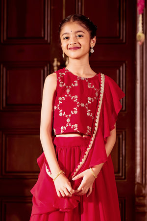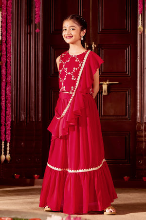 Red Sequin & Golden Embroidered with Solid Circular Skirt for Kids