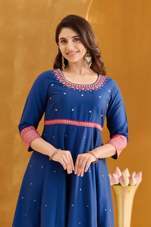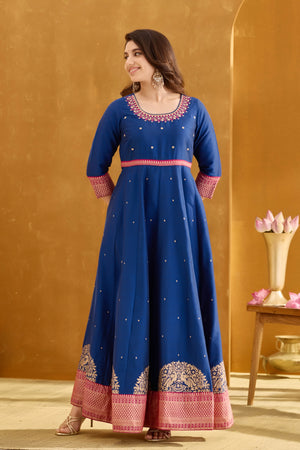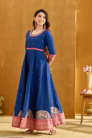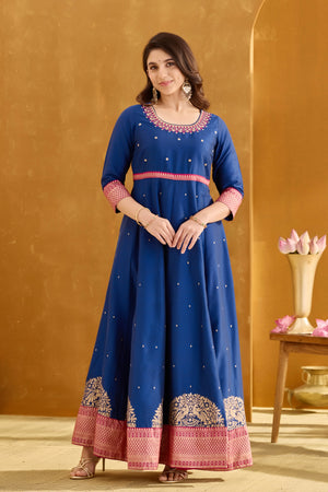Royal Blue Anarkali Dress with Golden Embroidery Neckline & Brocade Border