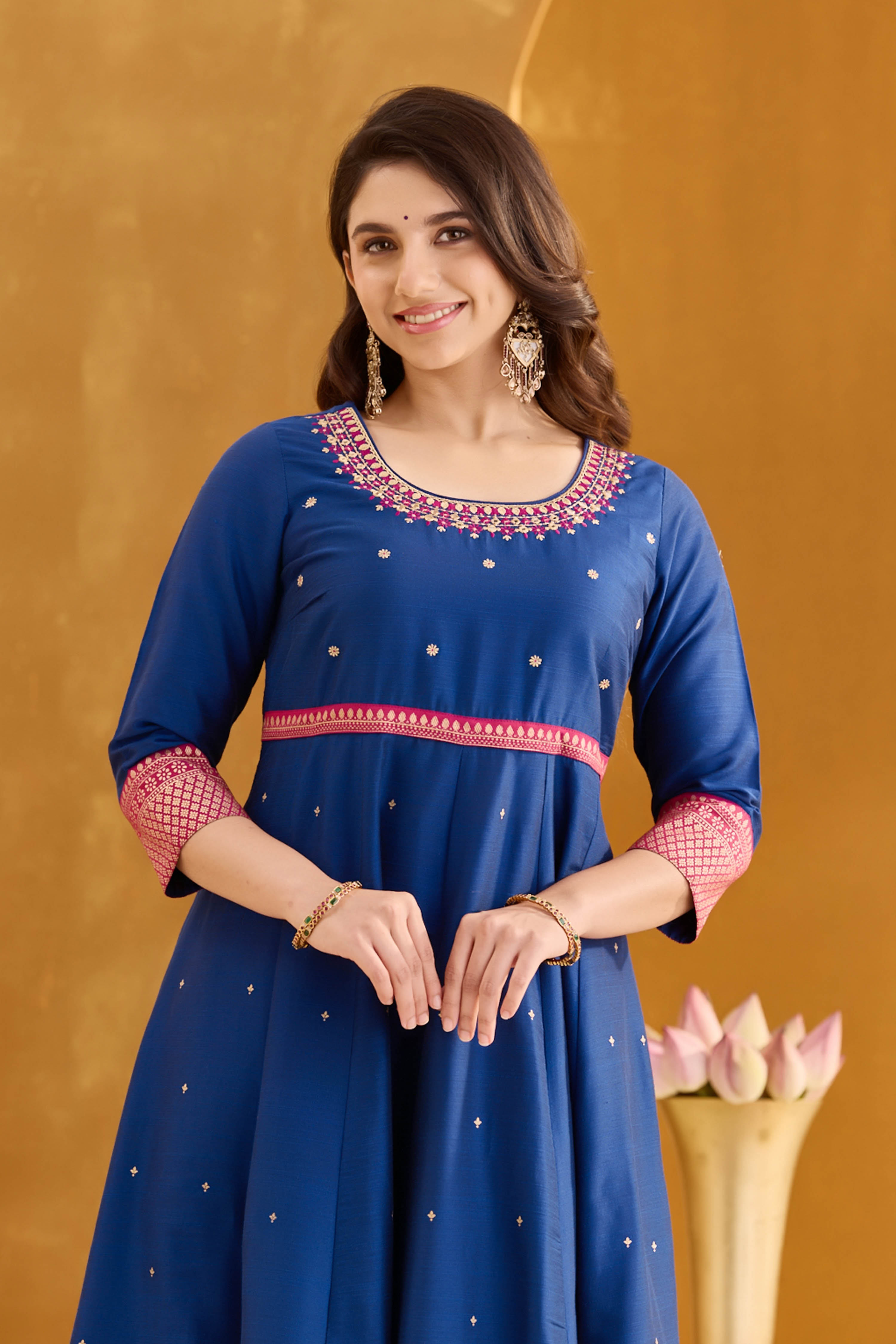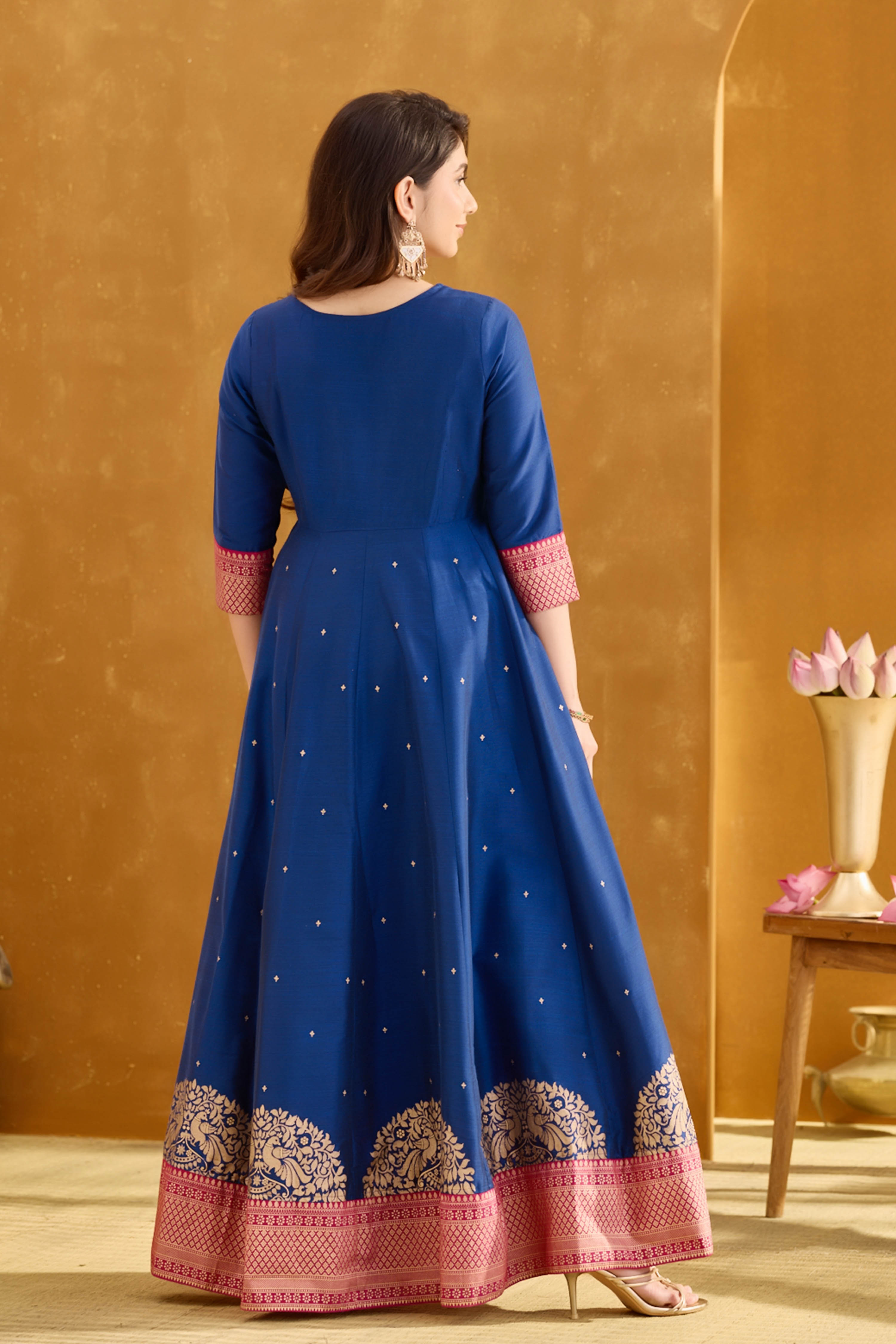 Dazzle in this royal blue A-line Anarkali, adorned with intricate golden embroidery and a brocade border. Made from silky slub with cotton patch lining, this elegant festive wear is perfect for Diwali and wedding celebrations.