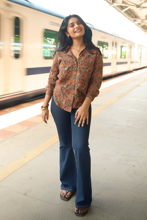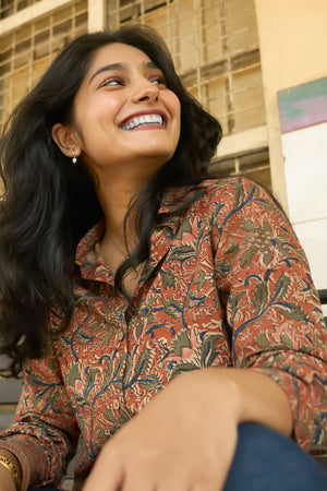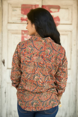 Rusty Orange Cotton Shirt with Kalamkari Design For Casualwear