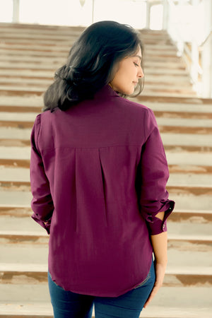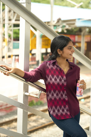 Stylish purple cotton shirt featuring traditional Ikkat design, collar neck, and full sleeves. Functional placket with front buttons ensures comfort and ease—perfect for office or casual wear.