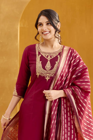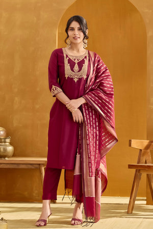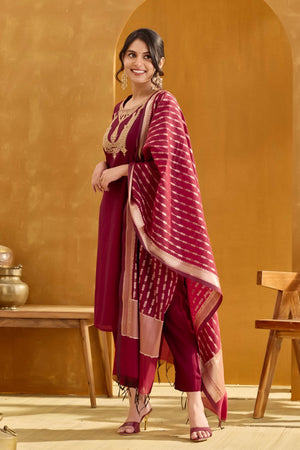 Maroon Kurta Set with Embellished Golden Yoke