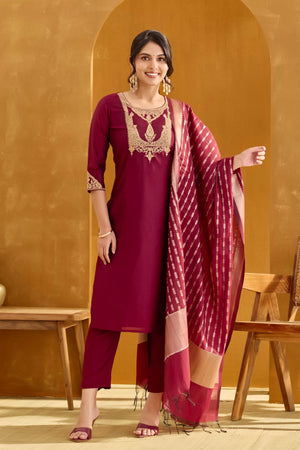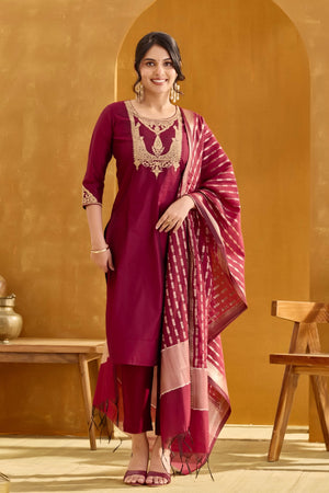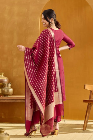 Radiate festive elegance in this maroon kurta set featuring an embellished golden thread yoke and round neck. Paired with vatican bottoms and a maroon-golden brocade dupatta, the chanderi fabric with cotton lining makes it perfect for Diwali celebrations.