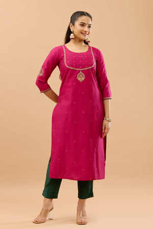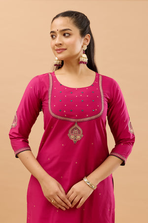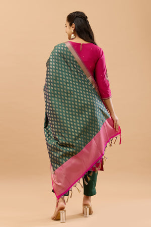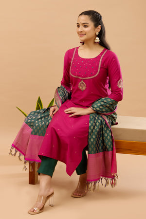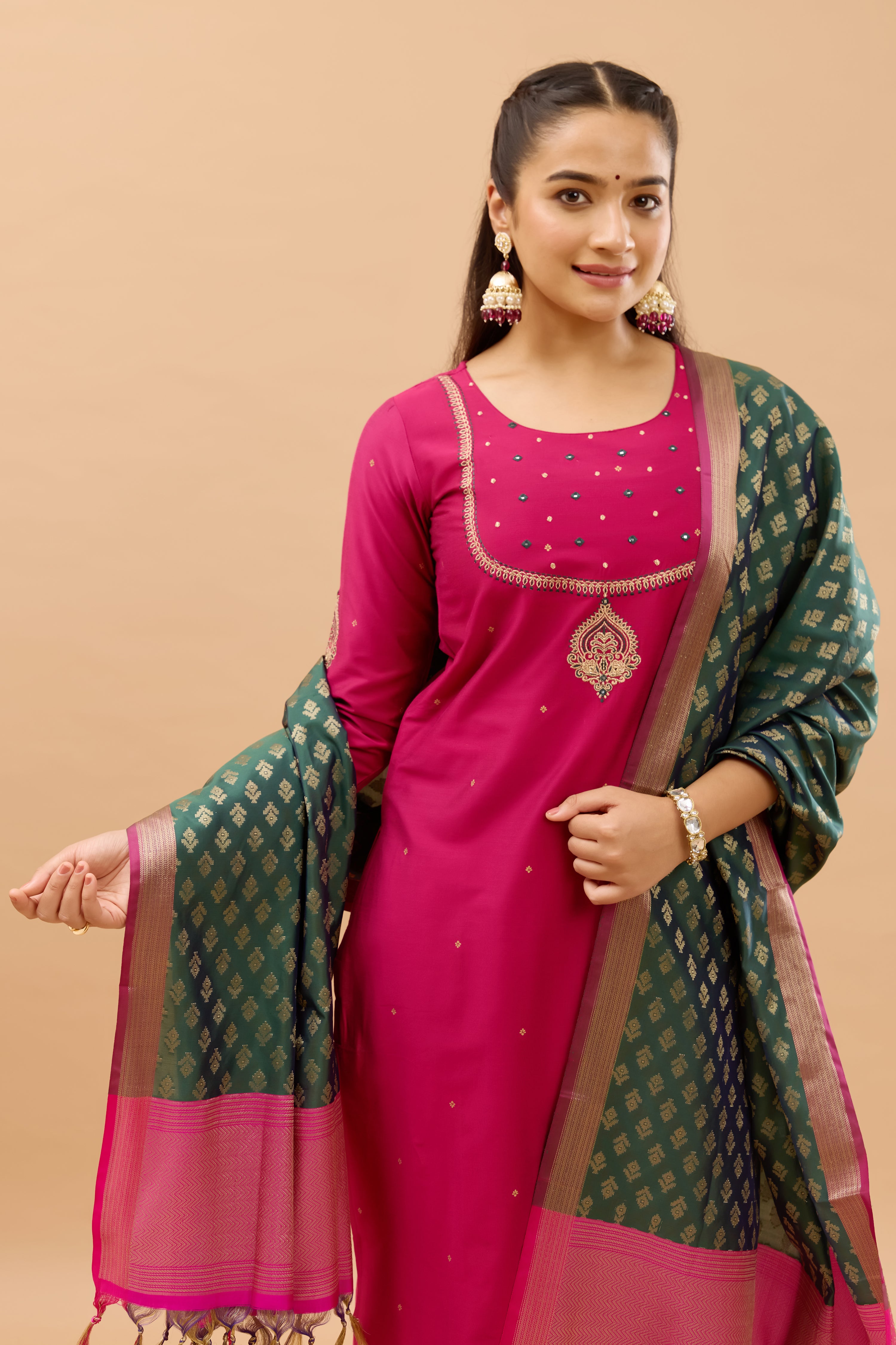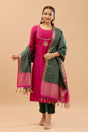 Jewel Line Embellished Magenta & Green Kurtaset with Brocade Dupatta