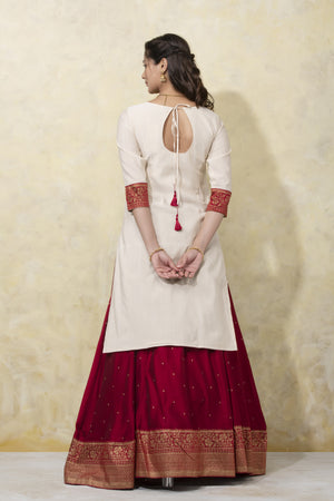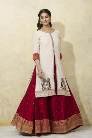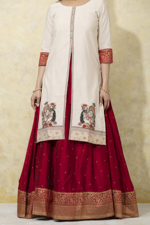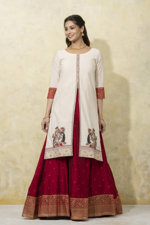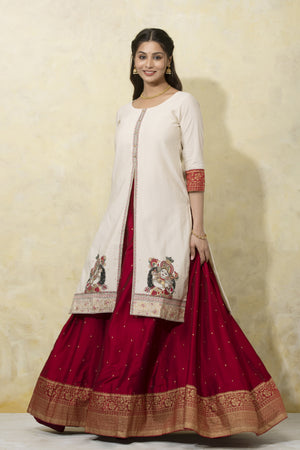 A knee-length kotta khaki top with a front slit, round neckline, and 3/4th sleeves, featuring a striking mural print. Designed with a back tie-up for a flattering fit. Paired with a vibrant red silky slub panelled skirt, complete with a drawstring and back elastic for comfort. Fully lined with cotton for breathability. A graceful pick for Vishu festivities.