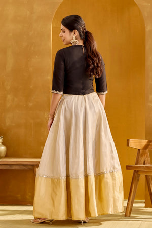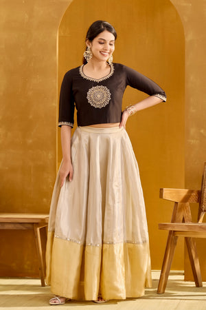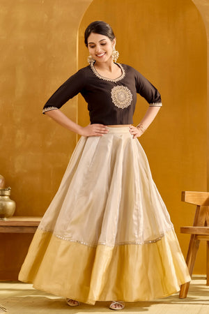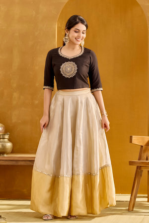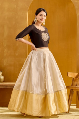 Turn heads in this black and beige-golden skirt set featuring a silky slub crop top with golden embroidery and foil mirror work. Paired with a shimmery circular tissue skirt and cotton lining, it’s ideal for Diwali and festive occasions.