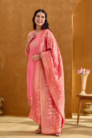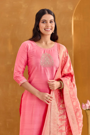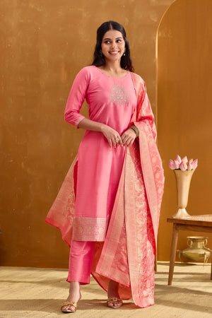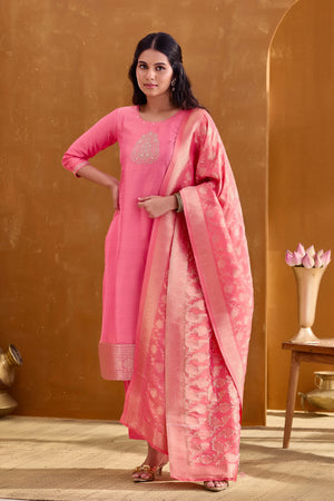 Straight-Line Kurta Set with Foil Mirror & Embroidery on Top & Brocade Dupatta- Pink