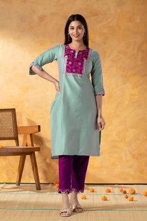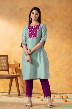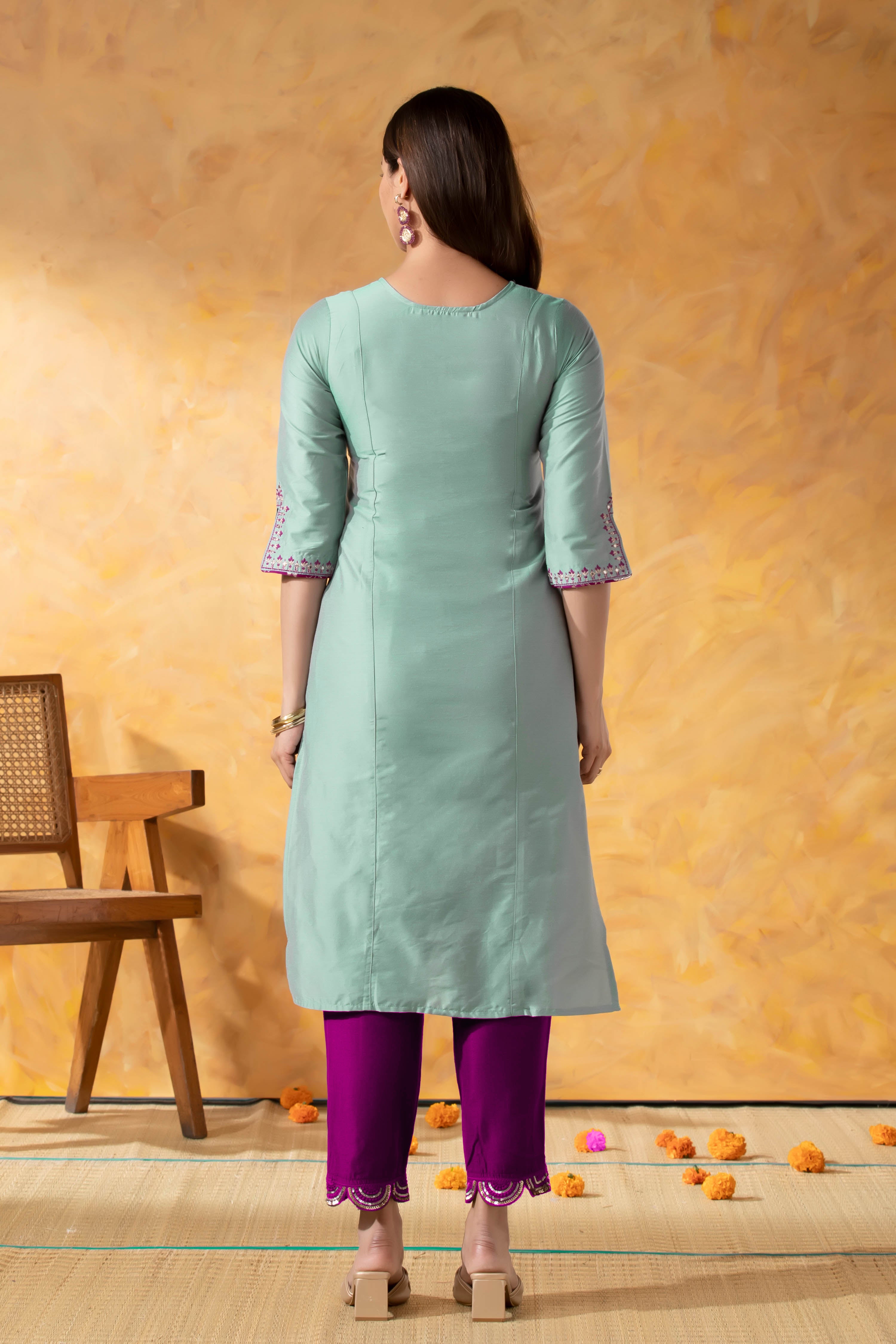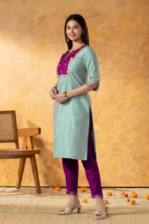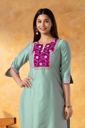 Turquoise Straight Line Kurta with Weaved Yoke & Foil Mirror Work