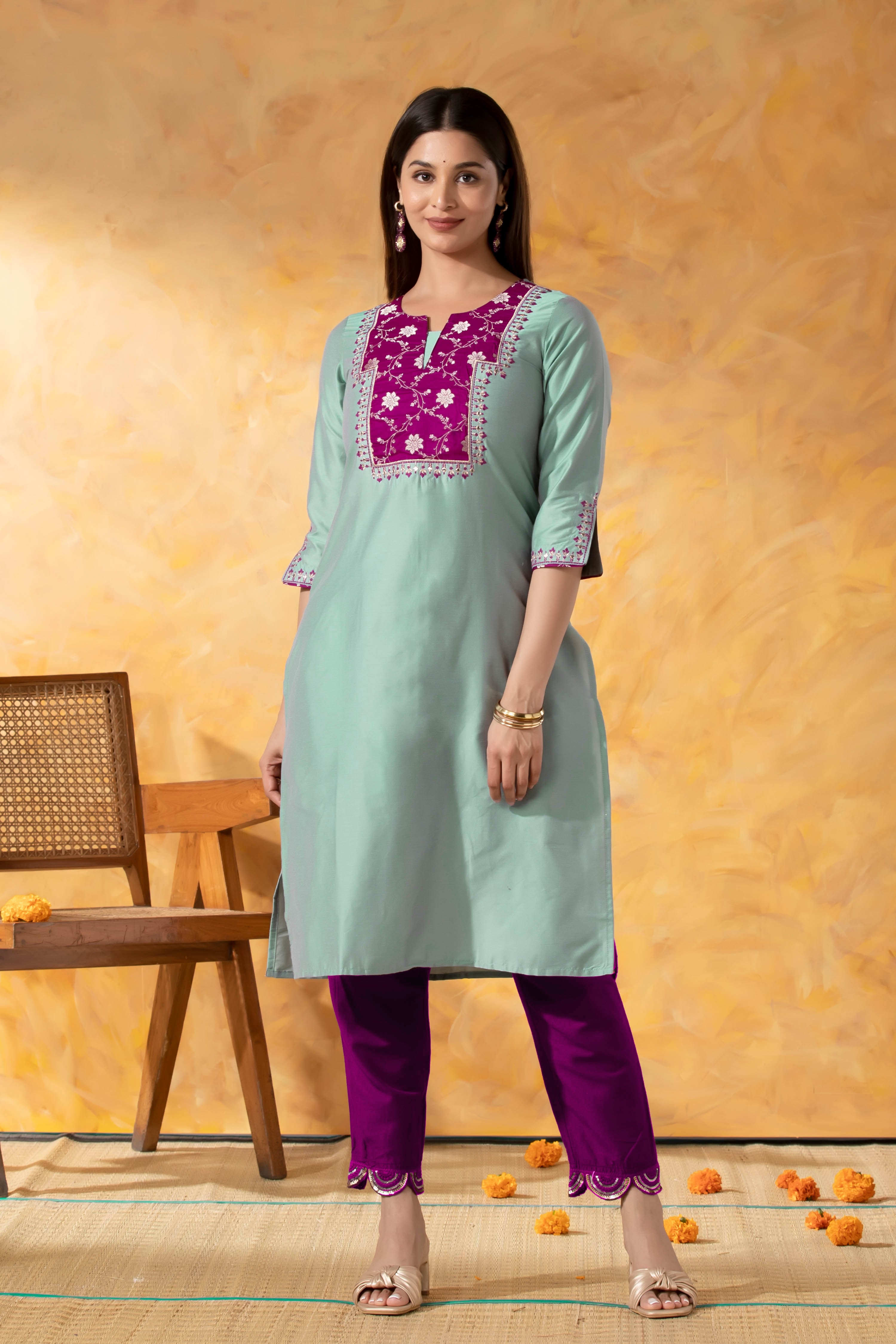 Celebrate Diwali in elegance with this turquoise kurta featuring a weaved yoke, foil mirror accents & embroidery. A stylish straight-line fit crafted in poly cotton for comfort & festive charm.