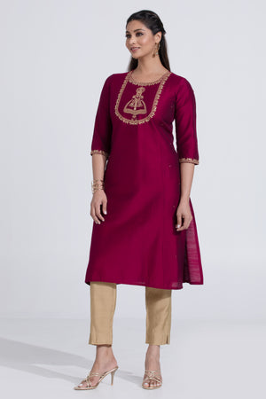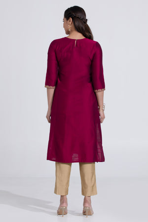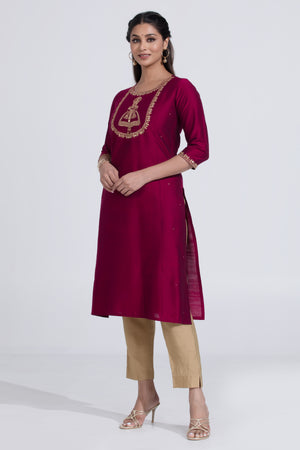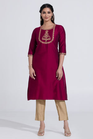 Wine Coloured Straight Kurta with Kathakali Design & Foil Mirror